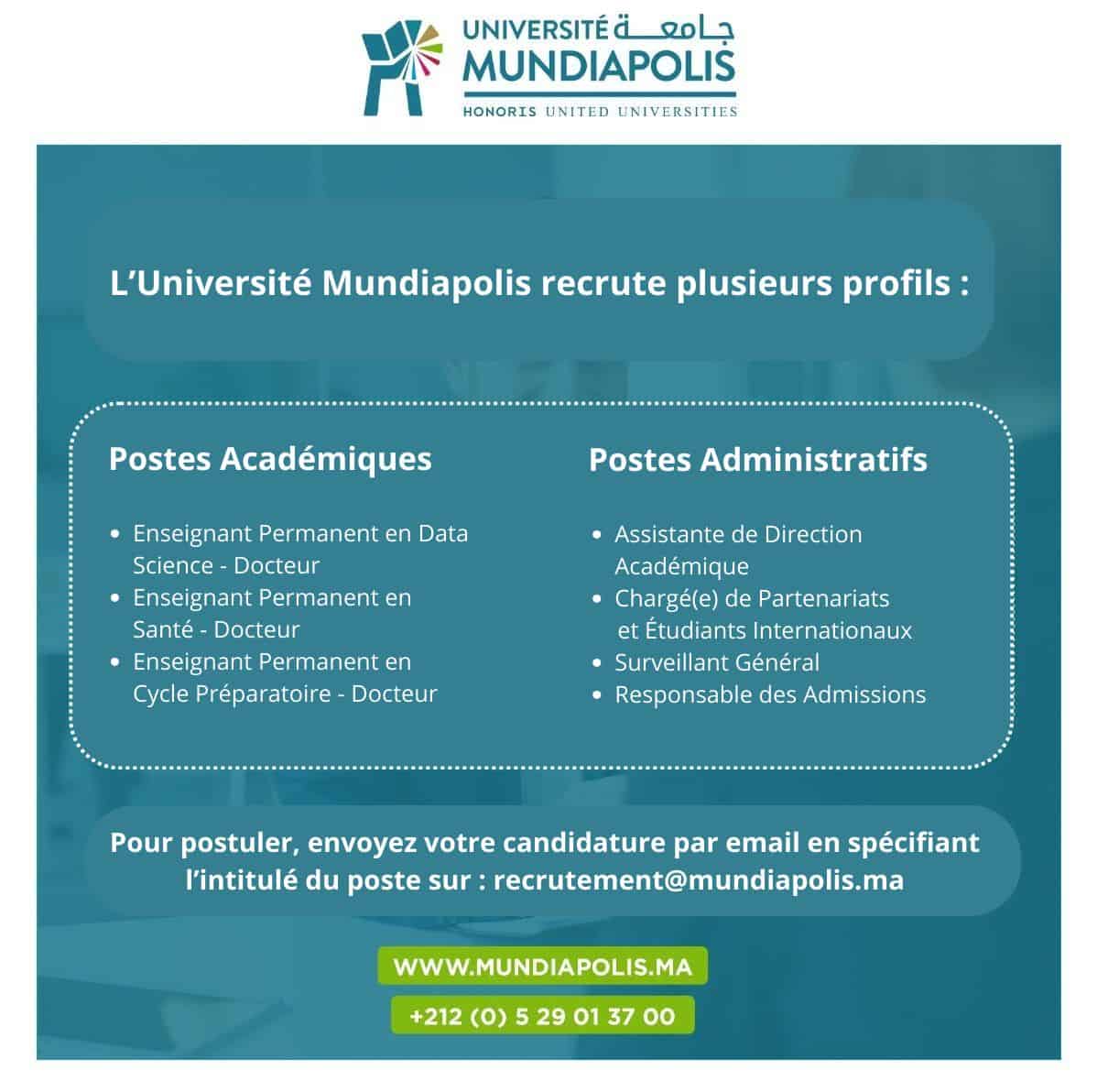 L’Université Mundiapolis propose de nombreuses opportunités passionnantes pour les professionnels académiques et administratifs qualifiés. Avec son engagement en faveur de l’excellence académique et de l’innovation, cette université de premier plan offre un environnement stimulant et propice à la réussite